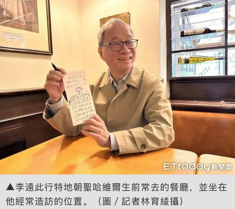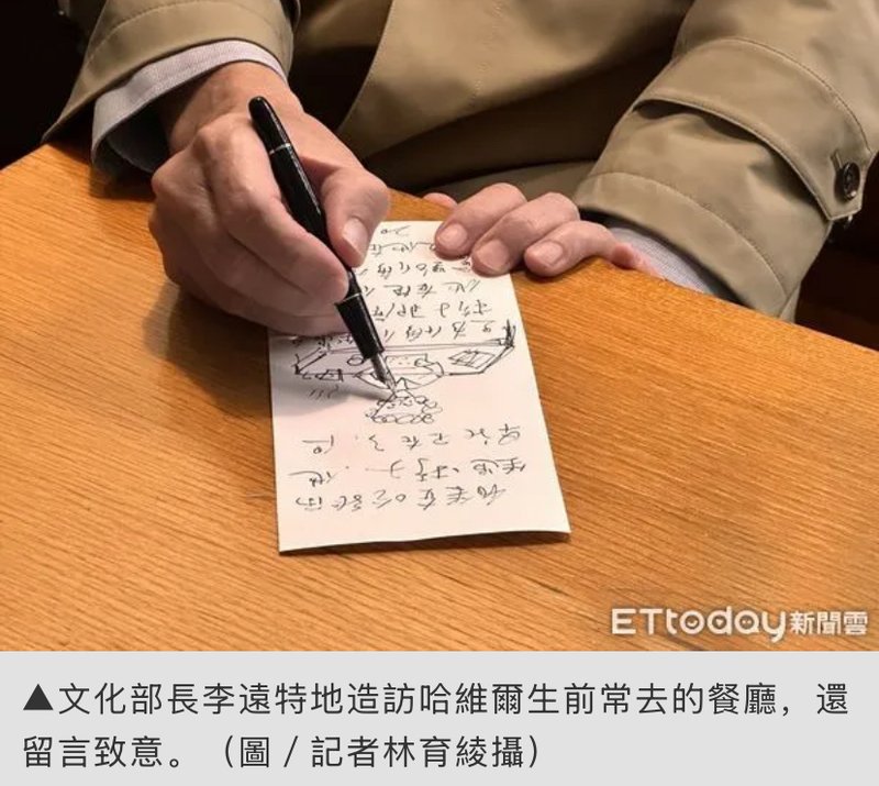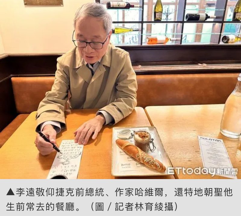 李遠表示,哈維爾應該是第一個從劇作家成為總統的人,對他十分景仰。此行赴歐,他也特地朝聖哈維爾生前常去的餐廳,並坐在他經常造訪的位置,一邊塗鴉畫下他腦中哈維爾在桌上書寫的模樣,並寫下自己的心境,「我坐在哈維爾坐過的椅子上,他早就不在了。⋯⋯我在想他通常會點什麼咖啡,然後他在想什麼呢?」