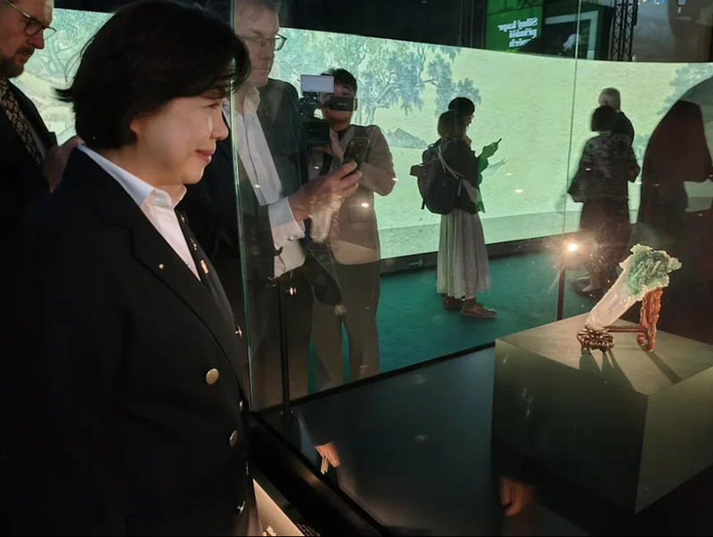 國民黨立委楊瓊瓔於捷克國家博物館的故宮特展欣賞人氣國寶〈翠玉白菜〉。(李侑珊攝)