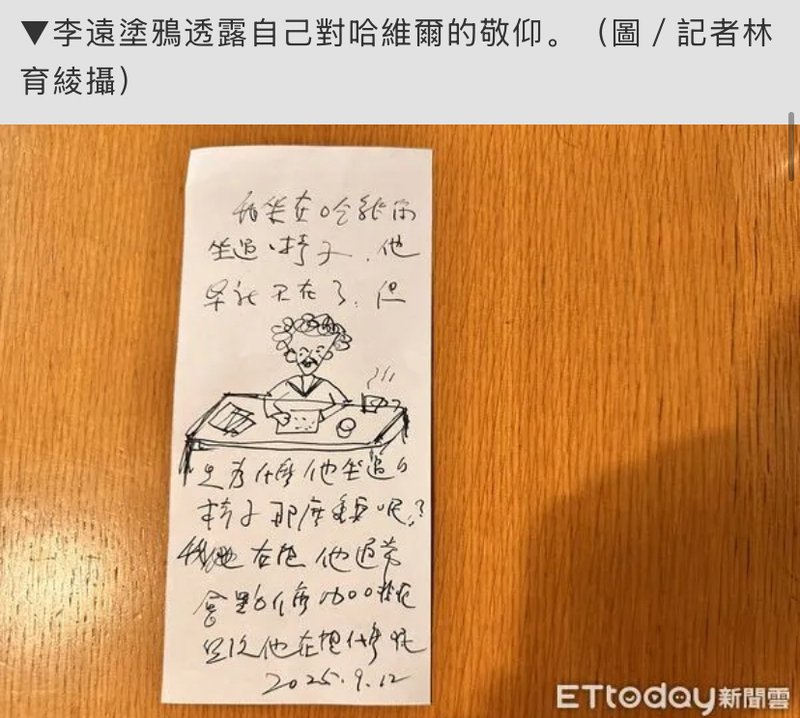 李遠表示,哈維爾應該是第一個從劇作家成為總統的人,對他十分景仰。此行赴歐,他也特地朝聖哈維爾生前常去的餐廳,並坐在他經常造訪的位置,一邊塗鴉畫下他腦中哈維爾在桌上書寫的模樣,並寫下自己的心境,「我坐在哈維爾坐過的椅子上,他早就不在了。⋯⋯我在想他通常會點什麼咖啡,然後他在想什麼呢?」